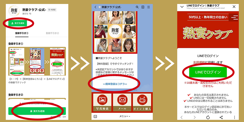 「熟宴クラブ」は、50代、60代、70代の紳士・熟女の熟年世代が出会いマッチングしチャットするLINE連携型チャットアプリになります。